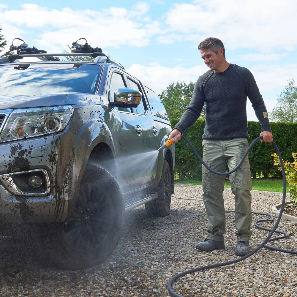Na gebruik draait u simpelweg de kraan en tuinspuit dicht waarna de slang aan de kraanzijde kan worden losgekoppeld. Het resterende water in de slang kan eenvoudig worden geleegd en nuttig worden gebruikt door op de gewenste plaats in de tuin de tuinspuit weer open te draaien waarna de slang leegloopt en weer moeiteloos en compact kan worden opgeborgen. Door de hoge drukbestendigheid kan TuffHoze ook worden gebruikt in combinatie met bijvoorbeeld een tuinpomp of hogedrukreiniger. Deze Hozelock TuffhoZe heeft een lengte van 25 meter, ideaal voor middelgrote tuinen. TuffHoze is verkrijgbaar in lengtes van 12,5 / 25 en 35 meter. Alle Tuffhoze slangen zijn standaard uitgerust met robuuste metalen slangtules, soft touch slangkoppelingen met waterstop, een  universeel kraanstuk voor aansluiting op nagenoeg ieder buitenkraan, en een verstelbare tuinspuit. Op TuffHoze is een garantie van 20 jaar van toepassing.Â